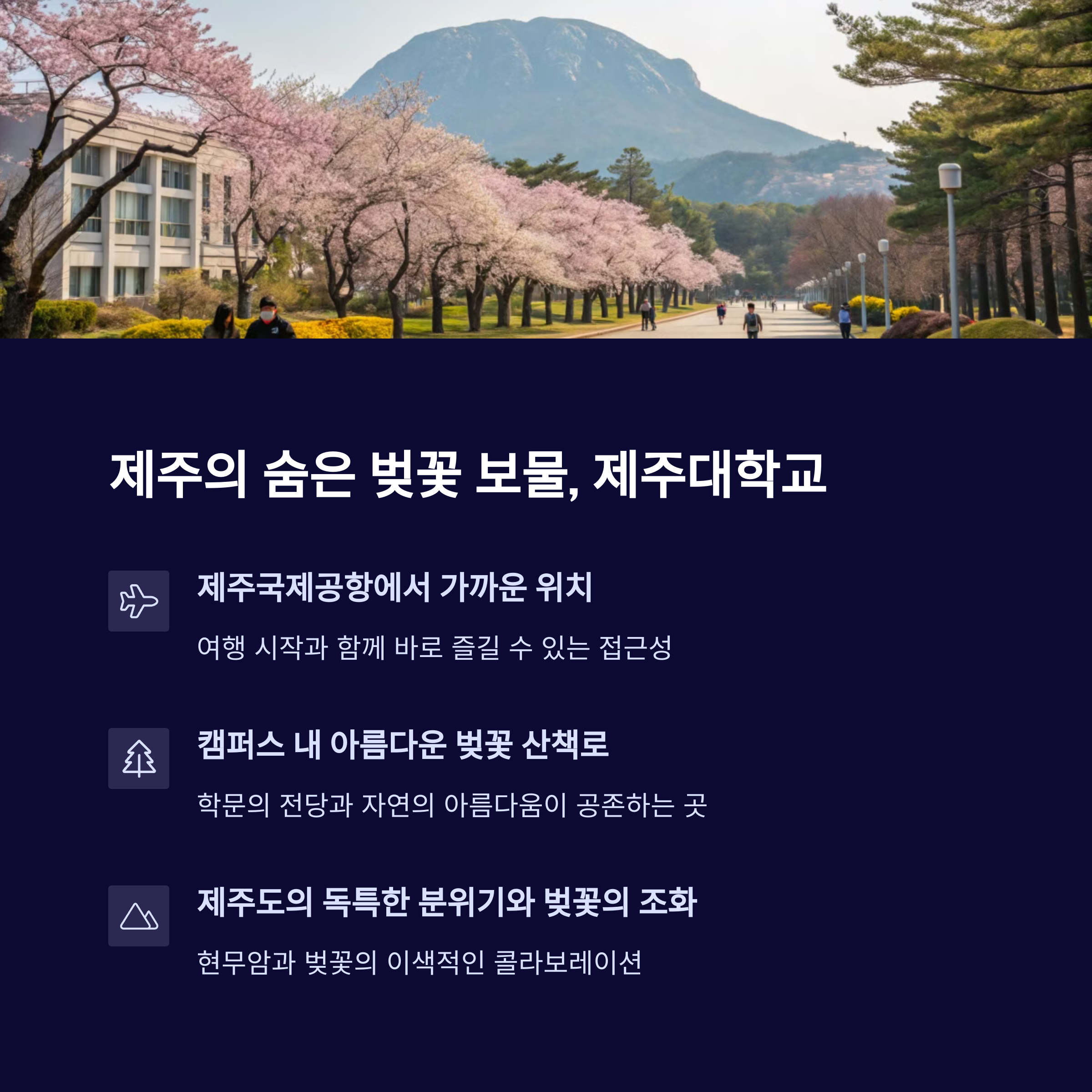 | 제주대학교 | 공항 근처, 캠퍼스 벚꽃 | 접근성이 좋고 조용한 분위기 |