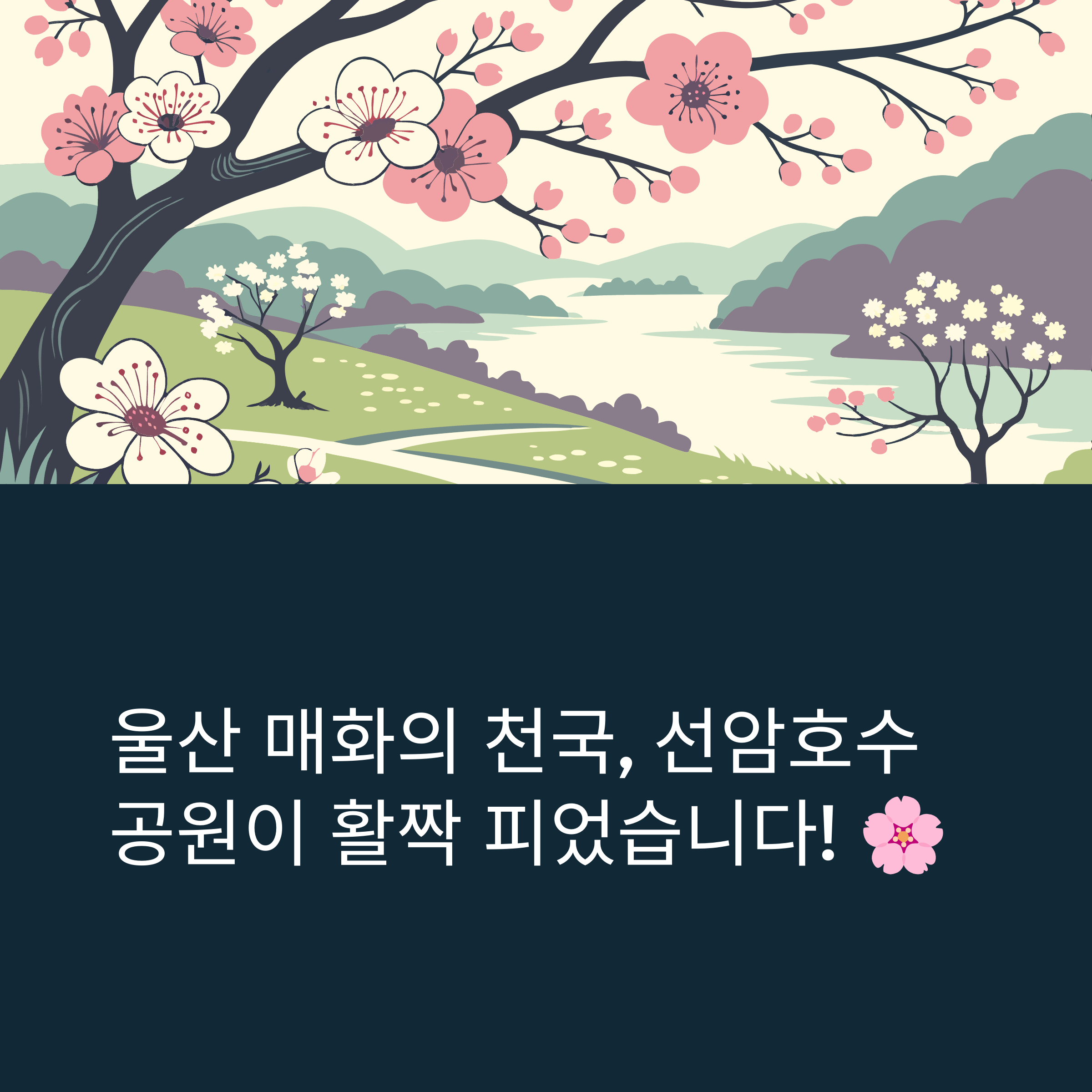 선암호수공원을 방문해보셨나요? 매화꽃 개화 상태는 어땠는지, 추천하고 싶은 포토 스팟이 있는지 댓글로 남겨주세요!