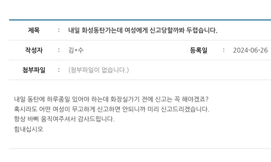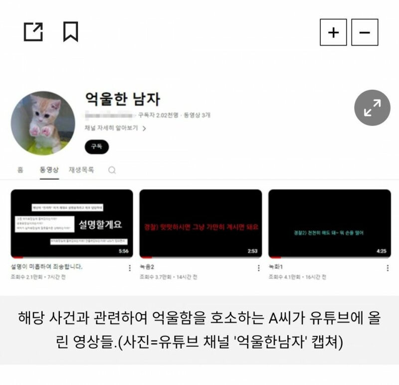 A씨는 경기도 동탄에 있는 한 아파트 헬스장에서 운동 중에 남자 화장실을 이용하였다. 다음날 경찰이 찾아와서 A씨에게 "여자화장실에 있는데 어떤 남자가 들어와 자기 용변 보는걸 엿보고 갔다는 신고가 접수되었다. CCTV 확인 결과 A씨의 인상착의가 확인됐다"고 말했고 A씨는 "CCTV에 나온 게 정말 내가 맞느냐"고 물었고 "여자화장실에 들어간 적이 없다"고 말했다. CCTV를 확인하자고 했으나 경찰은 나중에 연락하겠다고 하며 기다리라고 하였으며. 떳떳하면 그냥 가만히 계시면 된다고 말하며 A에게 강압적인 태도로 몰아갔다. A씨는 경찰과의 대화를 녹음해 두었다가 유튜브에 올리면서 억울함을 호소했다